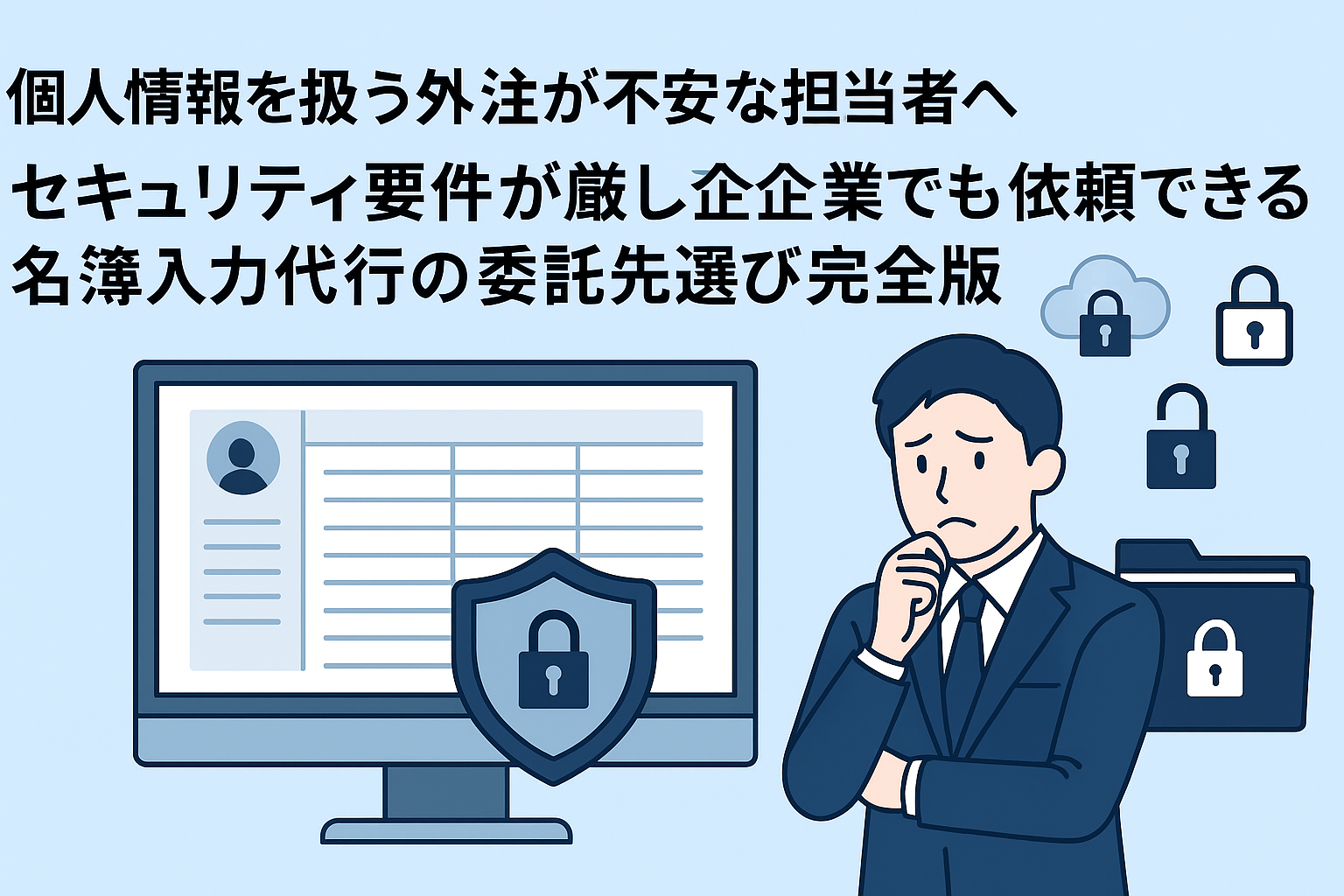 名簿入力は「入力するだけ」に見えて、実際は“個人情報を扱う業務そのもの”です。氏名・住所・電話番号・メールアドレスに加え、勤務先や部署、役職、取引履歴と紐づく情報まで含めると、情報の性質は一気に重くなります。だからこそ「外注したいけど怖い」「万が一が起きたら担当者の責任が重い」と感じるのは自然です。